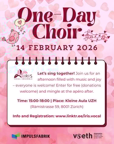 We are the Iris Vocal Ensemble, a small group of students and alumni from ETH Zurich and UZH who simply love singing together. We hope to see you soon!